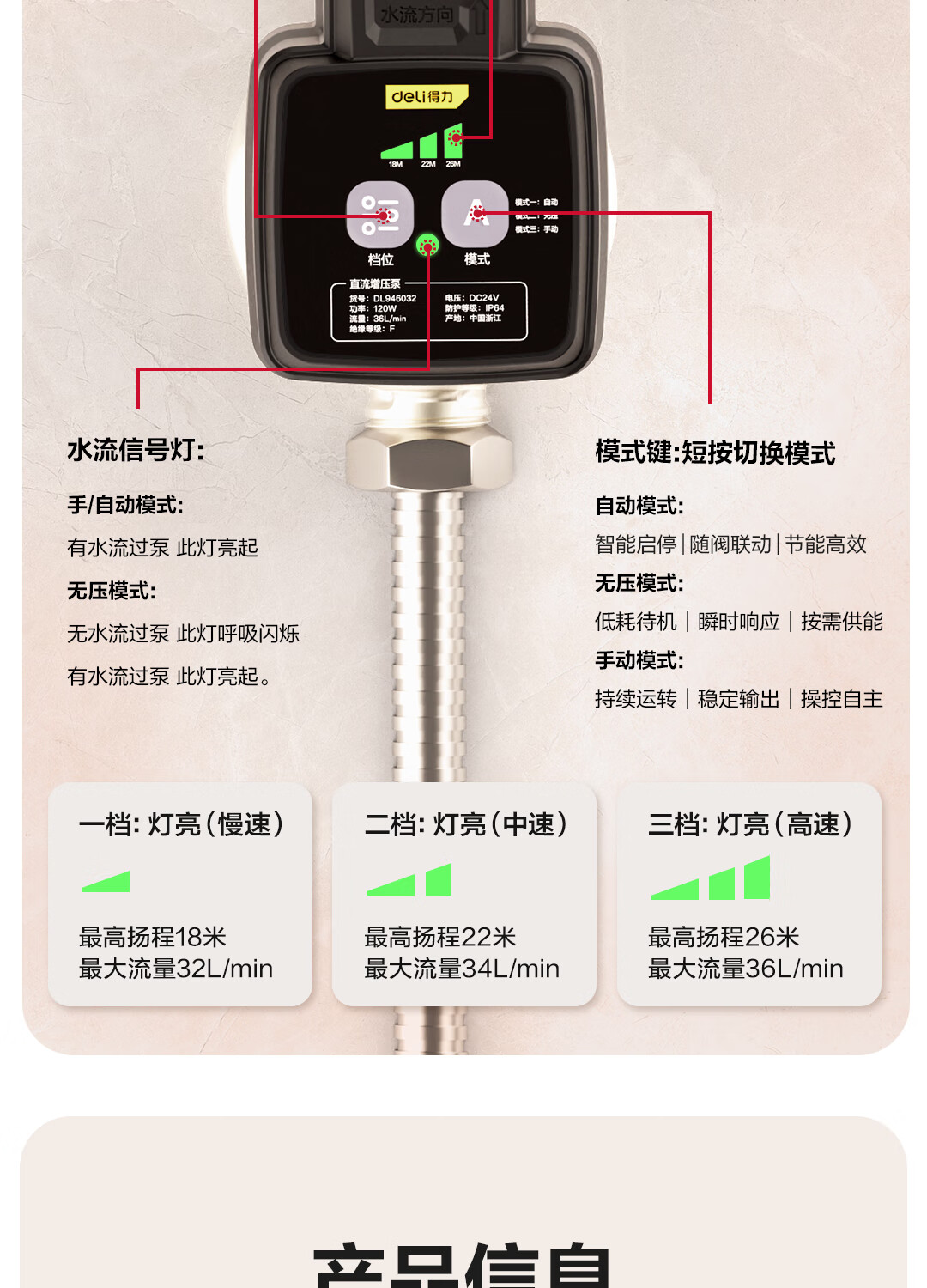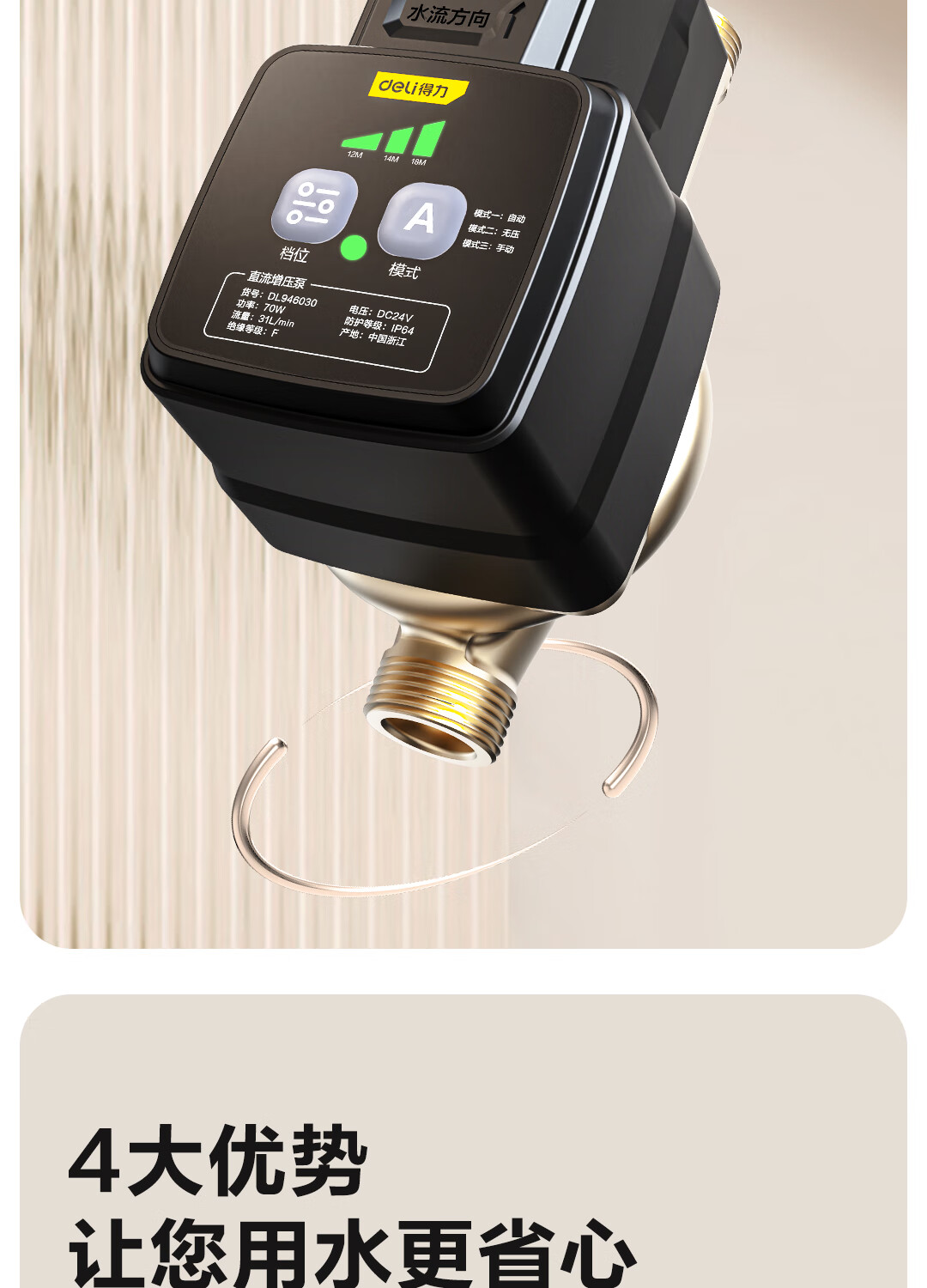 【得力DL946032】得力(deli)增压泵家用全自动低音自来水热水器加压曜石黑120W直流增压泵