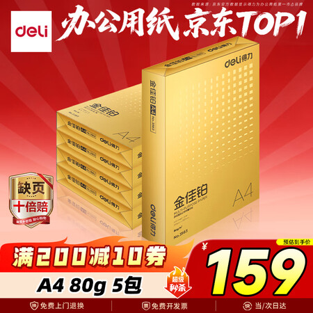 首页 / 办公用品 / 办公文具 / 办公用纸类 / 【得力3564】得力(deli)金佳铂A4打印纸80g500张*5包一箱高档加厚复印纸合同标书彩打纸整箱2500张3564【尊享品质】