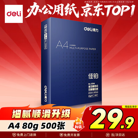首页 / 办公用品 / 办公文具 / 办公用纸类 / 【得力3594】得力(deli)佳铂A4打印纸80g500张高档单包复印纸加厚合同标书彩打纸打印书写3594【纸中贵族】