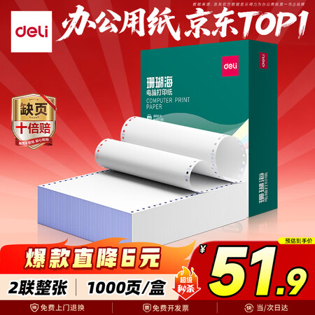 首页 / 办公用品 / 办公文具 / 办公用纸类 / 【得力(deli)S241-2】得力(deli)【缺页十倍赔】珊瑚海二联一等分不撕边针式电脑打印纸全白出库送货单1000页/箱241-2