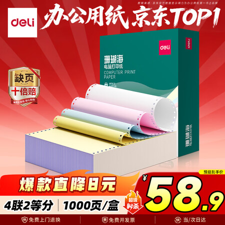 首页 / 办公用品 / 办公文具 / 办公用纸类 / 【得力(deli)S241-4-1/2C】得力(deli)【缺页十倍赔】珊瑚海四联二等分不撕边针式电脑打印纸彩色(白红蓝黄)送货单1000页241-4-1/2C