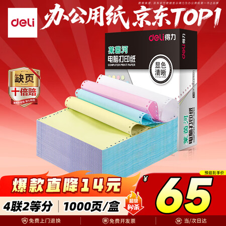 首页 / 办公用品 / 办公文具 / 办公用纸类 / 【得力(deli)L241-4-1/2C】得力(deli)【缺页十倍赔】高档莱茵河四联二等分不撕边针式电脑打印纸彩色(白红蓝黄)1000页241-4-1/2C