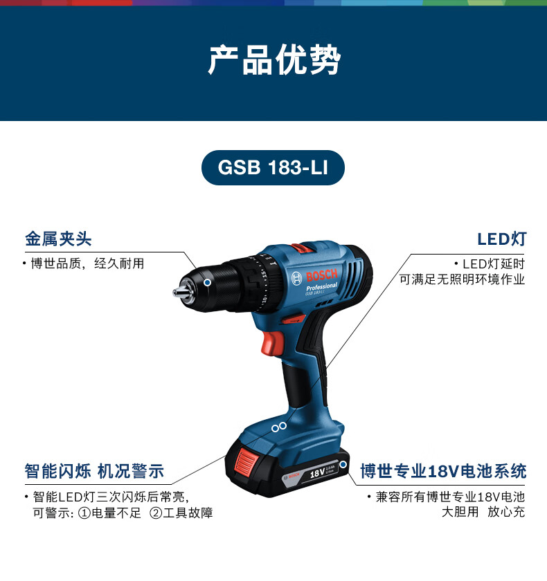 首页 / 动力工具 / 电动/气动工具 / 钻孔类 / 【博世GSB183双电】博世(BOSCH)18V锂电冲击钻充电式手电钻电动螺丝刀起子机GSB183-LI双电