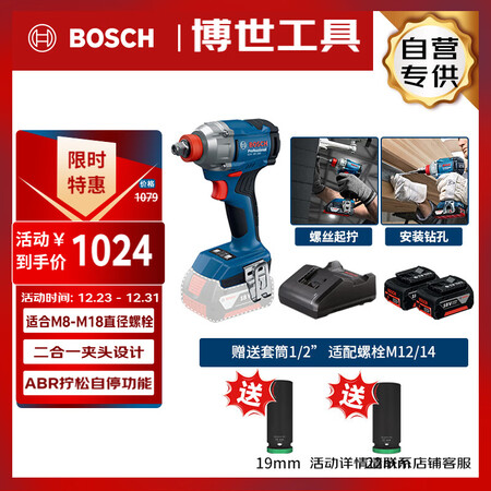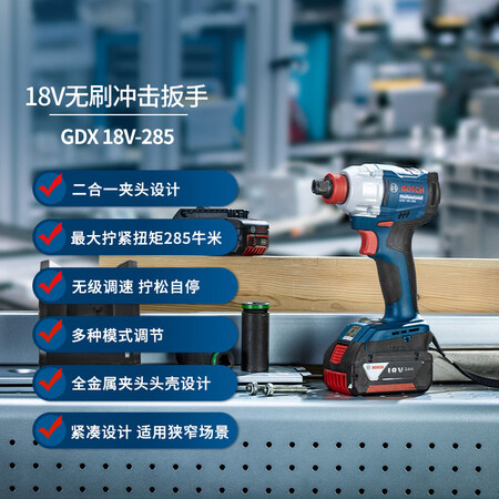 首页 / 动力工具 / 电动/气动工具 / 钻孔类 / 【博世GDX18V-285双电+套筒套装】博世(BOSCH)锂电冲击扳手18V无刷285牛米电动起子机GDX18V-285双电附套筒套装