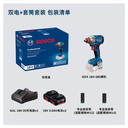 【博世GDX18V-285双电+套筒套装】博世(BOSCH)锂电冲击扳手18V无刷285牛米电动起子机GDX18V-285双电附套筒套装