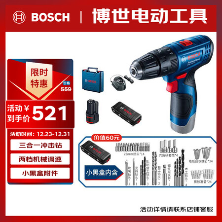 【博世GSB120单电促销版】博世(BOSCH)电钻钻墙打孔多功能家用螺丝刀GSB120单电12V锂电+小黑盒附件箱