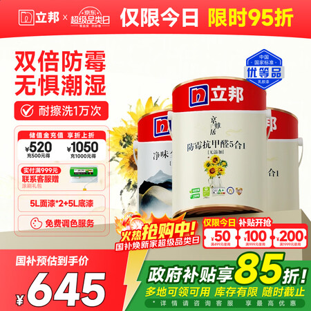首页 / 装饰建材 / 建筑装饰材料 / 砂浆 / 【立邦京雅居防霉抗甲醛5合1无添加内墙乳胶漆V2】立邦室内乳胶漆涂料油漆墙漆防霉抗甲醛五合一15L/约21KG套装可调色