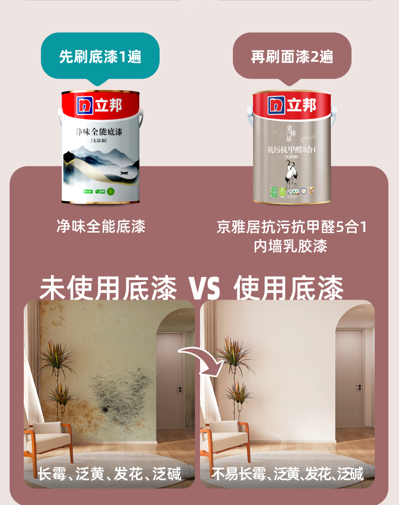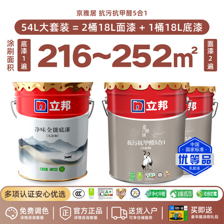 【立邦京雅居抗污抗甲醛5合1无添加内墙乳胶漆】立邦瓷净乳胶漆内墙漆油漆荷净抗污抗甲醛五合一54L/约75KG套装调色