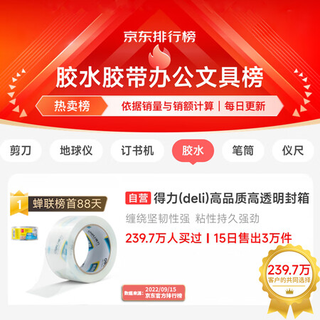 【得力30369】得力(deli)【超级爆款】高品质高透明封箱胶带/打包胶带60mm*100y*50um(91.4m/卷)单卷装防台风胶带30369