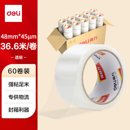 首页 / 工具耗材 / 胶带标签 / 胶带原材 / 【得力JD415】得力(deli)封箱胶带透明大卷/打包胶带48mm*40y(36.6米)60卷/箱办公用品JD415