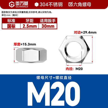 【固万基六角螺母】固万基(GUWANJI)六角螺母不锈钢螺母六角螺帽螺丝帽304六角螺母M20[10个/包]