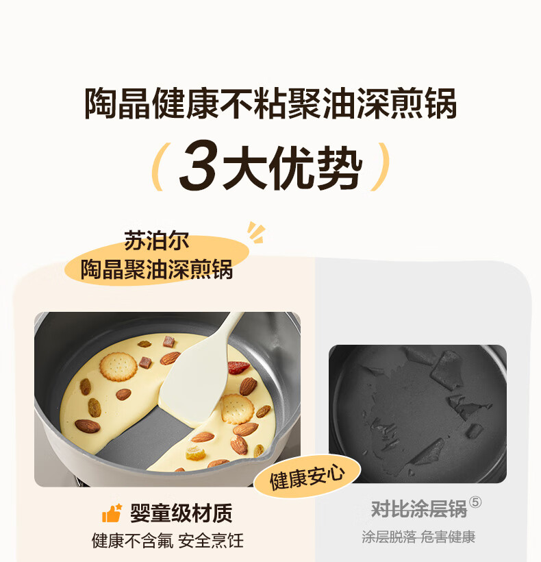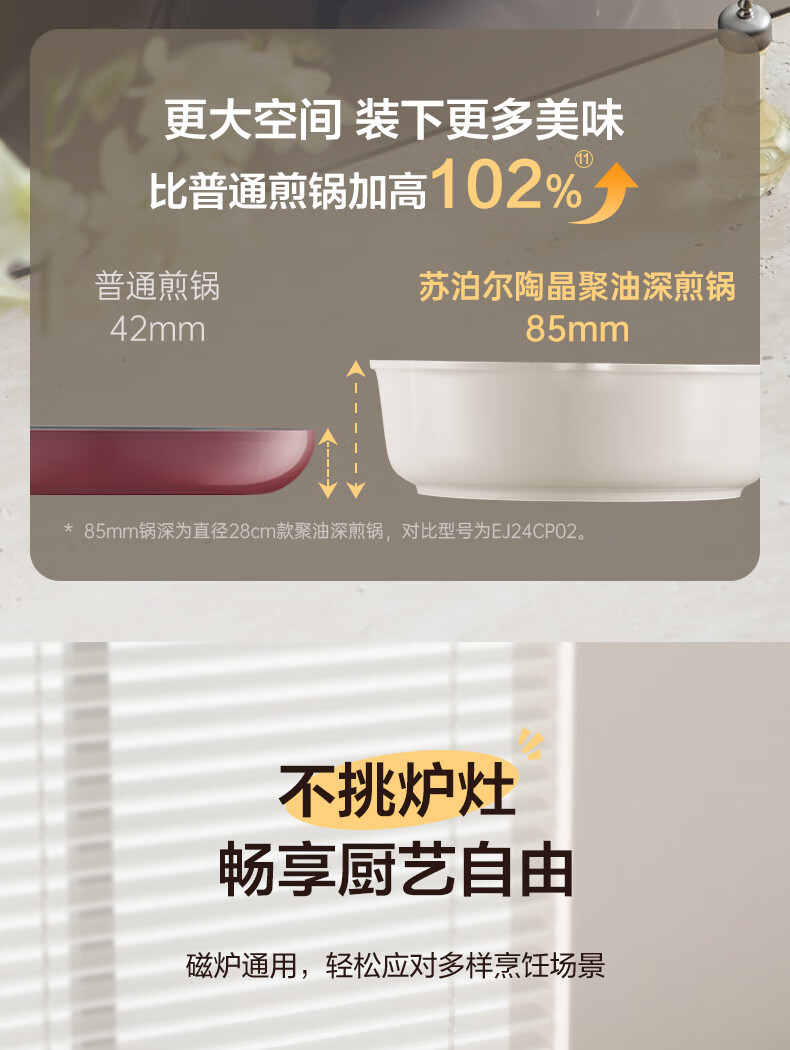 苏泊尔(SUPOR)炒锅不粘小炒菜锅陶瓷覆层家用平底锅聚油深煎锅电磁炉燃气灶通用【聚油防凸底】直径24cm