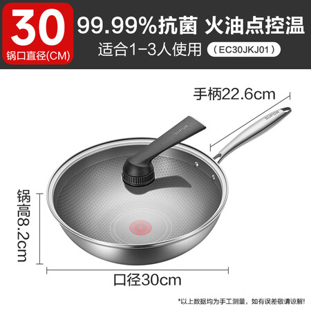 苏泊尔(SUPOR)炒锅不粘锅抗菌不锈钢炒菜锅家用蜂窝煎炒锅电磁炉燃气通用JKJ011-3人使用【抗菌蜂窝防粘】30cm