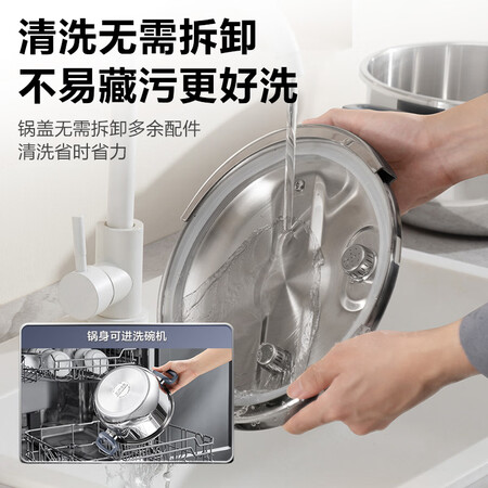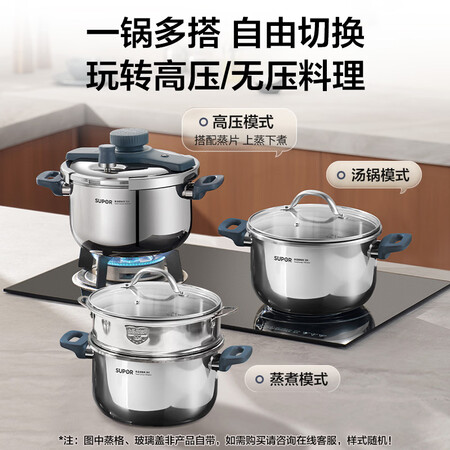 苏泊尔(SUPOR)高压锅家用304不锈钢压力锅防爆单手开合炖肉锅燃气灶电磁炉通用【可蒸可煮可炖】配玻璃盖蒸格汤勺22cm