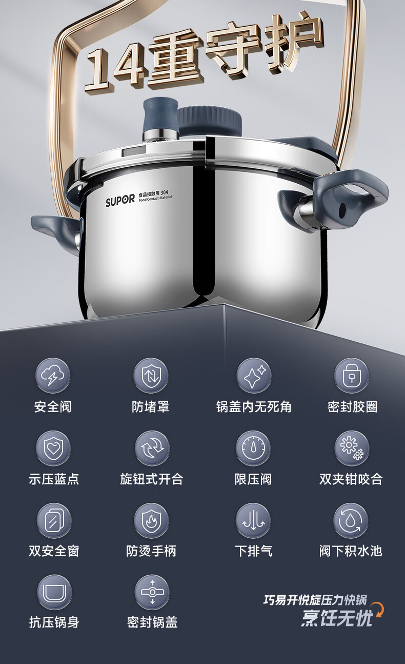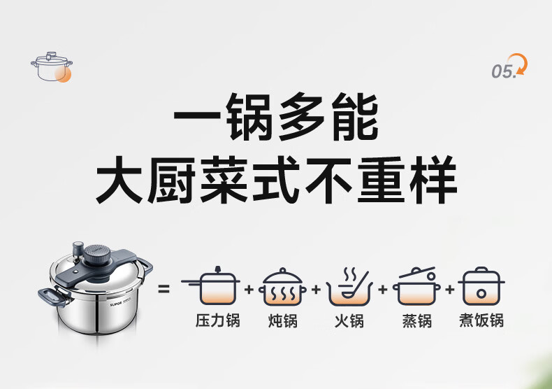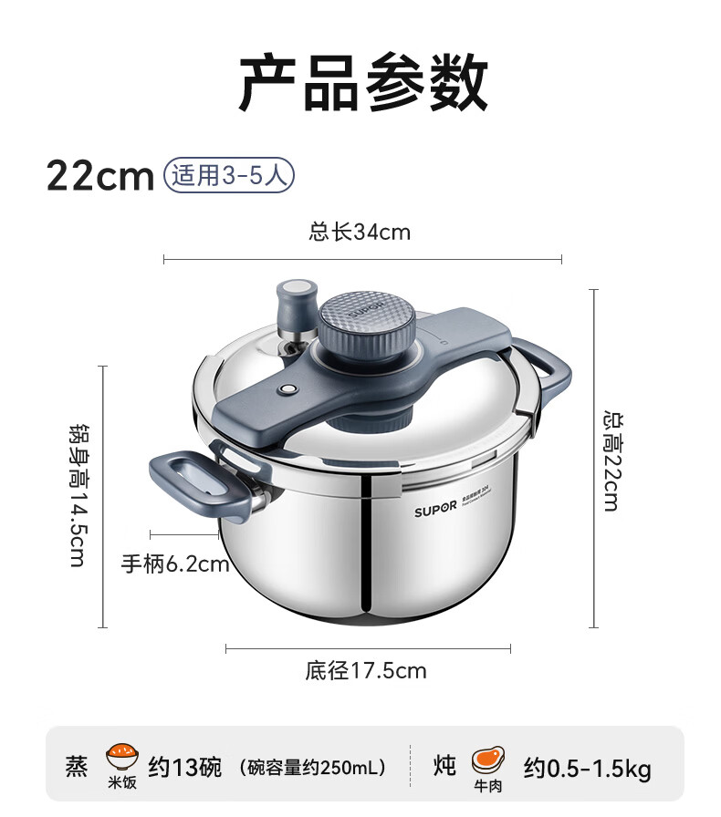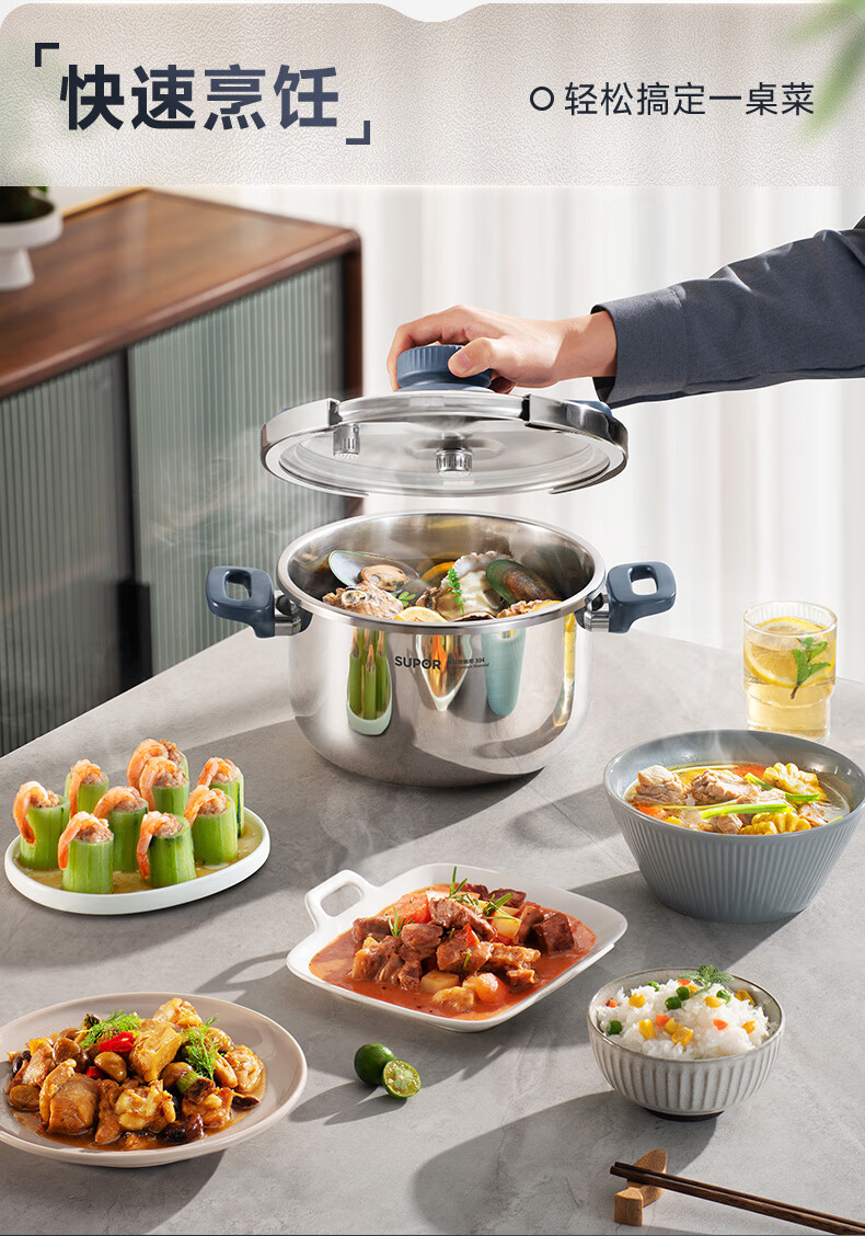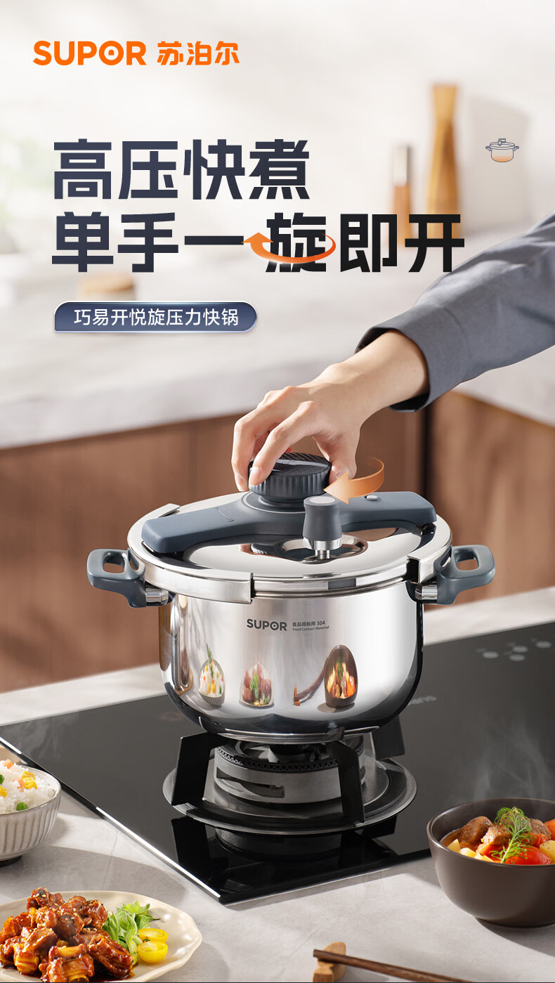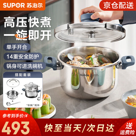 首页 / 家用电器 / 厨卫小型电器 / 煮蛋电炖锅 / 苏泊尔(SUPOR)高压锅家用304不锈钢压力锅防爆单手开合炖肉锅燃气灶电磁炉通用【可蒸可煮可炖】配玻璃盖蒸格汤勺22cm