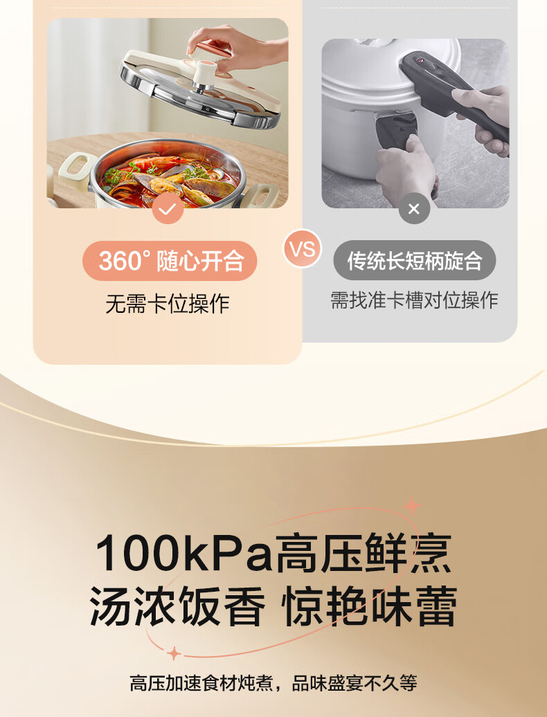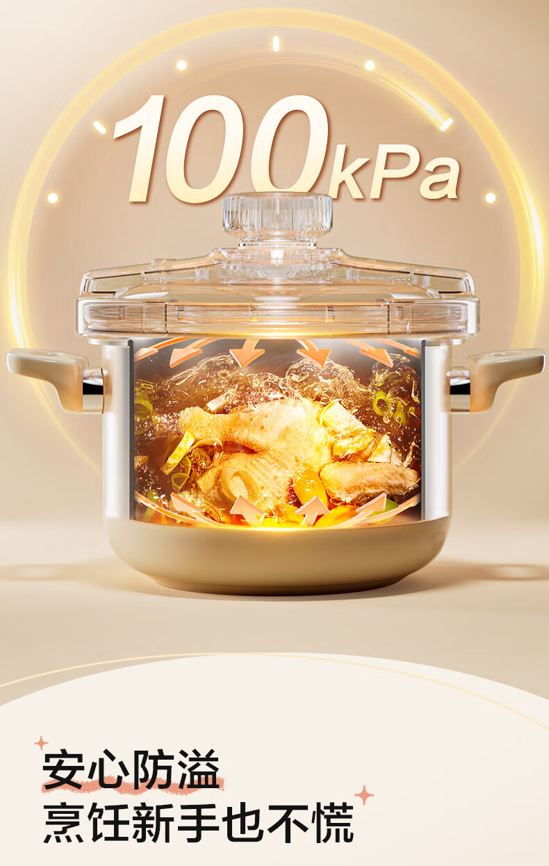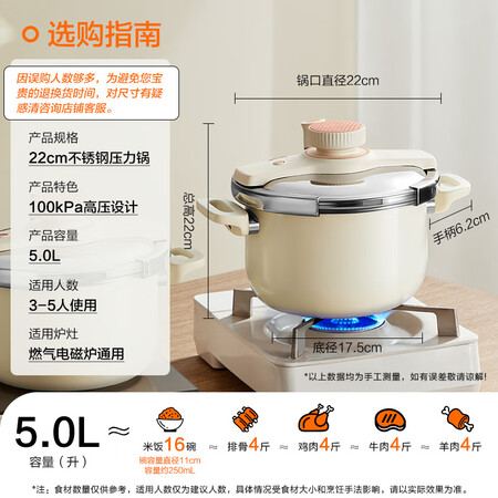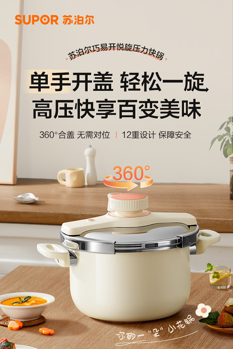 首页 / 家用电器 / 厨卫小型电器 / 电锅多功能锅 / 苏泊尔(SUPOR)高压锅家用304不锈钢100kPa压力锅单手开合双耳悦旋复底磁炉通用【配刀具4件套】适用3-5人容量5L直径22cm