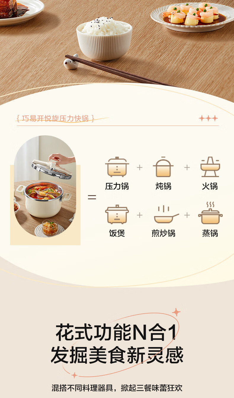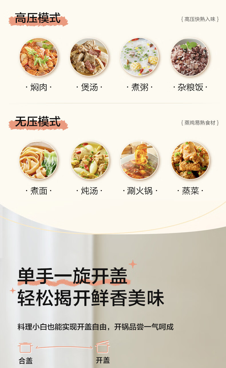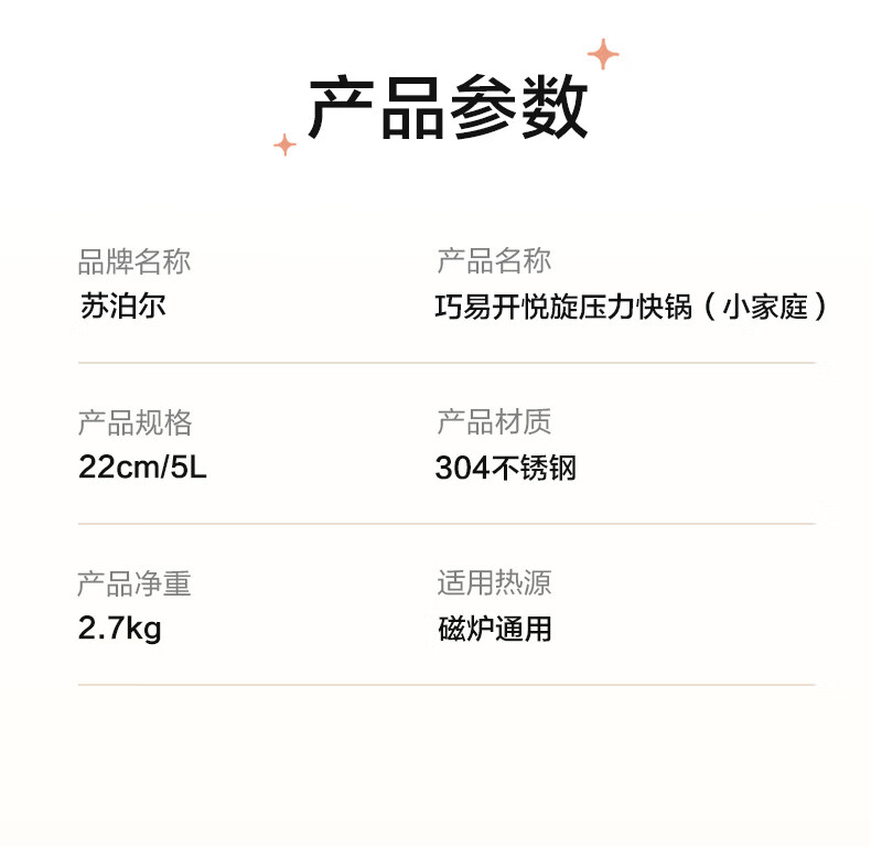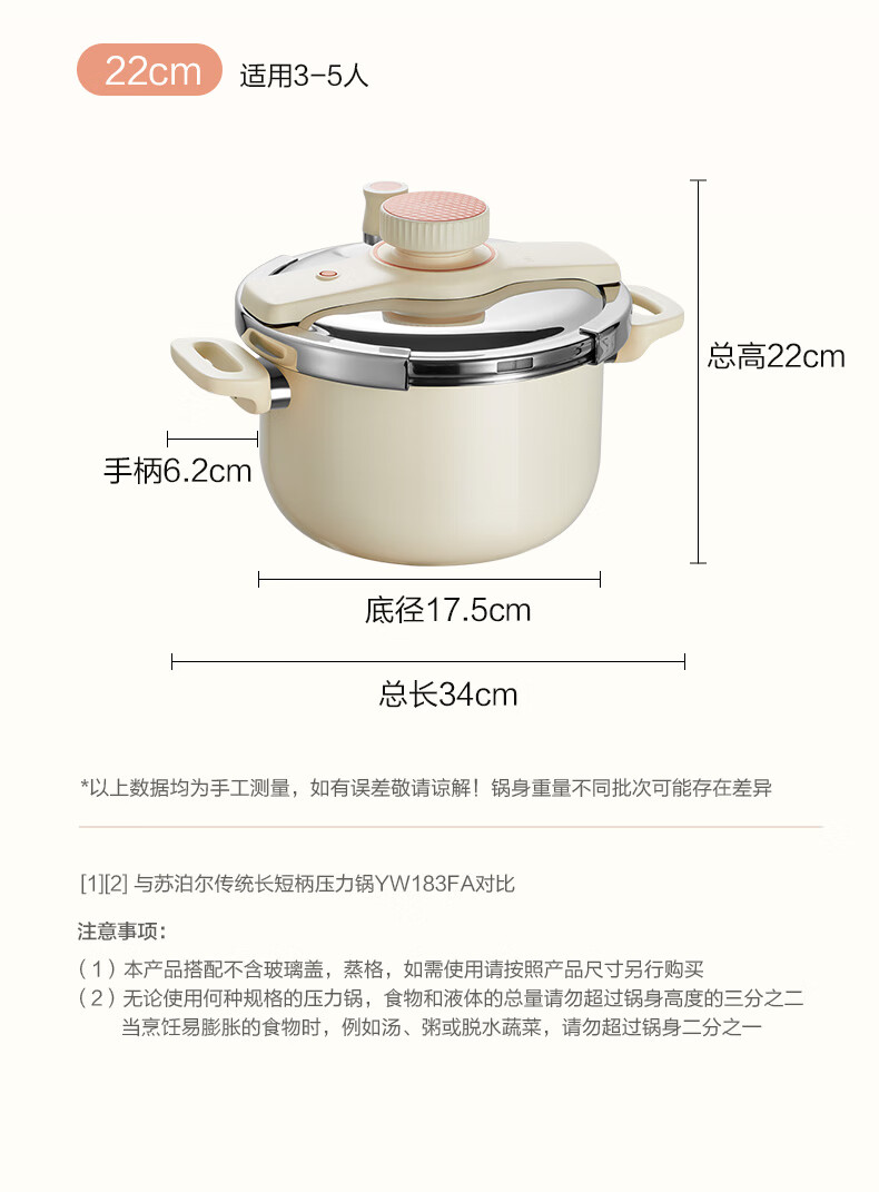 首页 / 家用电器 / 厨卫小型电器 / 电锅多功能锅 / 苏泊尔(SUPOR)高压锅家用304不锈钢100kPa压力锅单手开合双耳悦旋复底磁炉通用【配刀具4件套】适用3-5人容量5L直径22cm