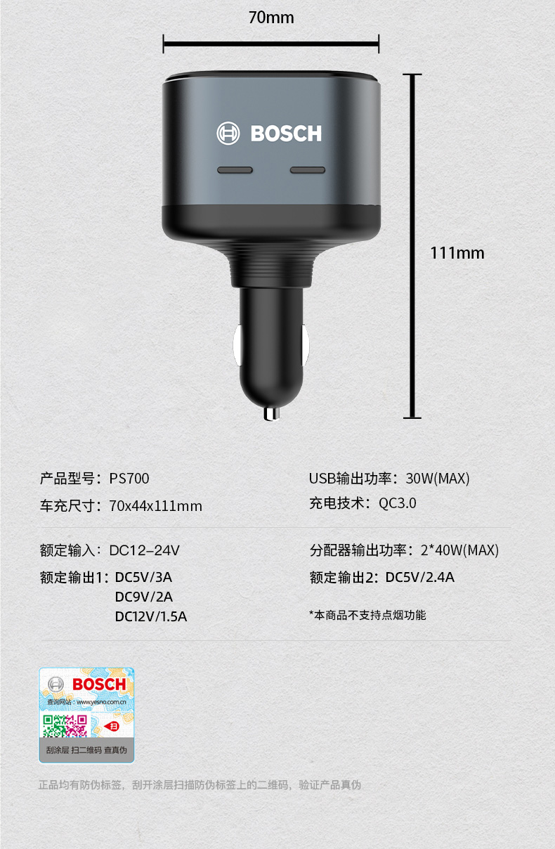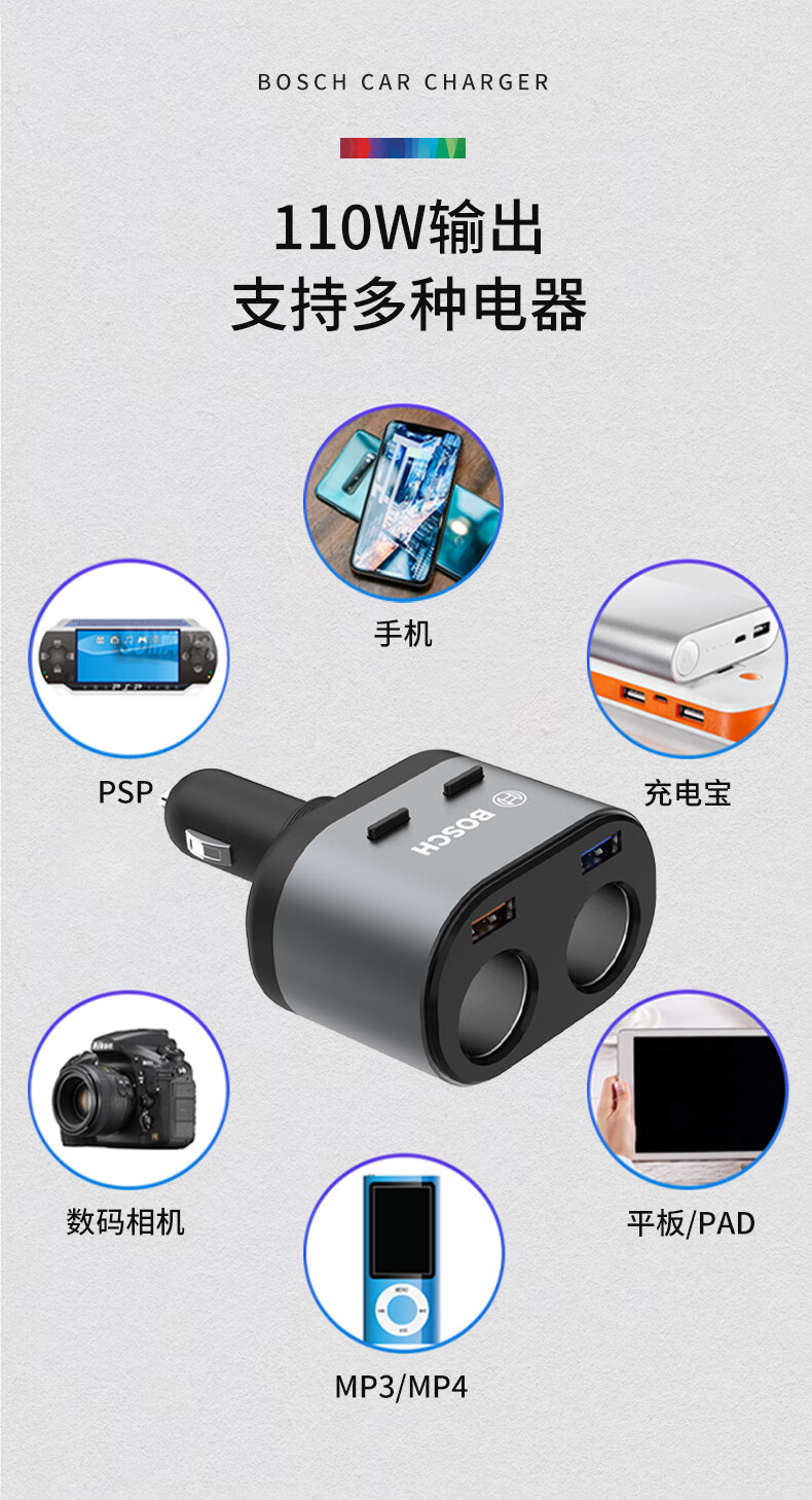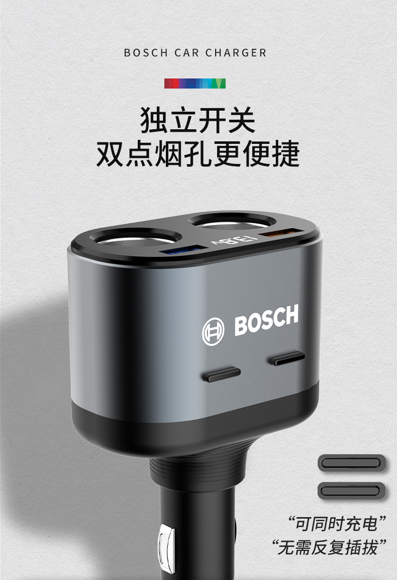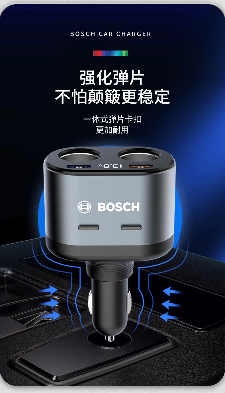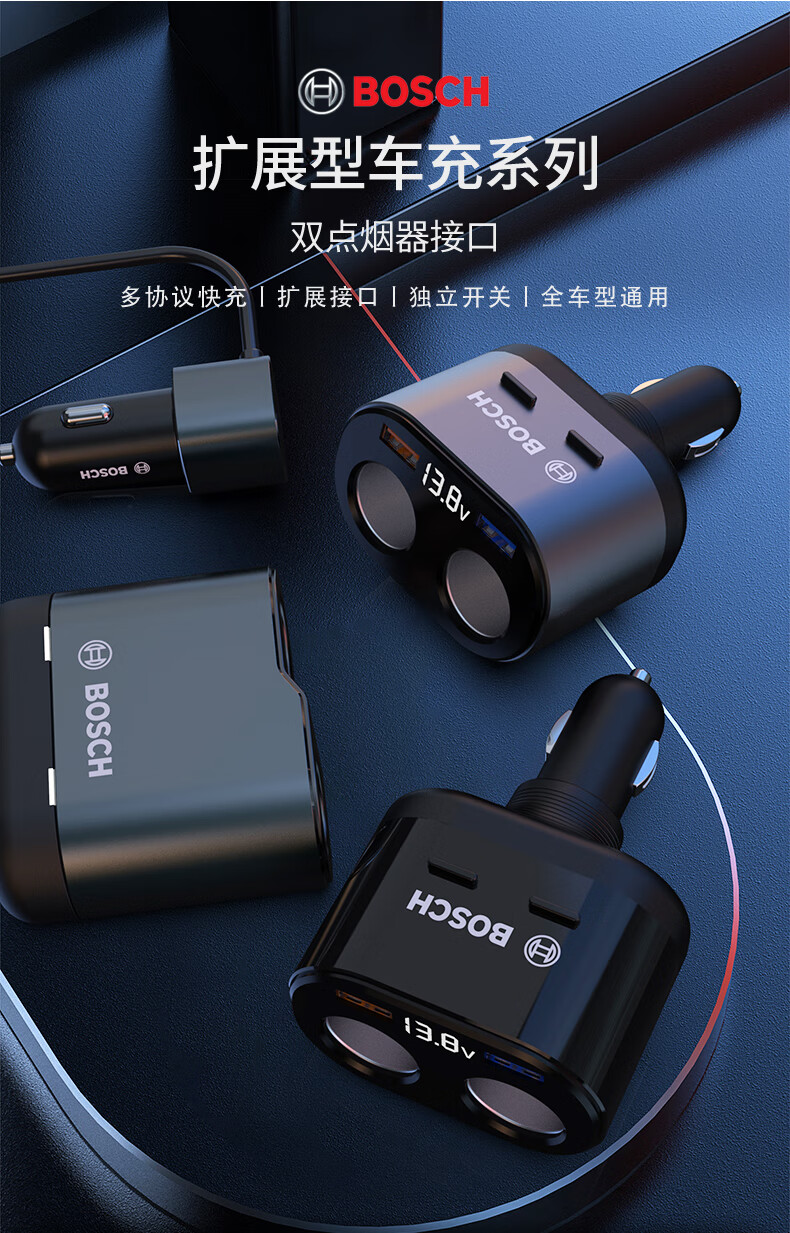 【博世PS700】博世(BOSCH)PS700车载充电器多功能汽车用一拖二三点烟器转换插头usb车充快充