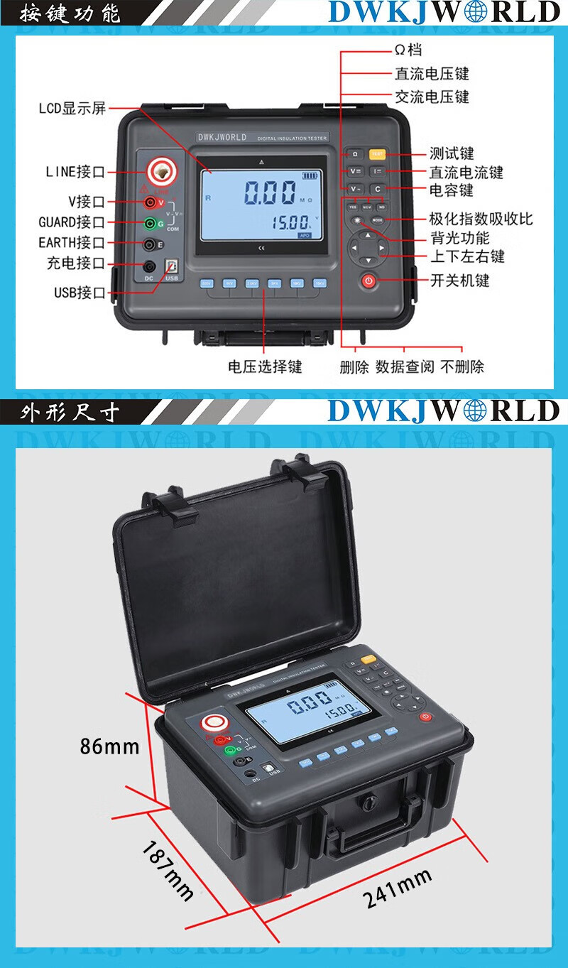 首页 / 仪器仪表 / 电工测量 / 电阻测试仪 / DWKJWORLDDW8125高压绝缘电阻测试仪(5KV,10TΩ)套