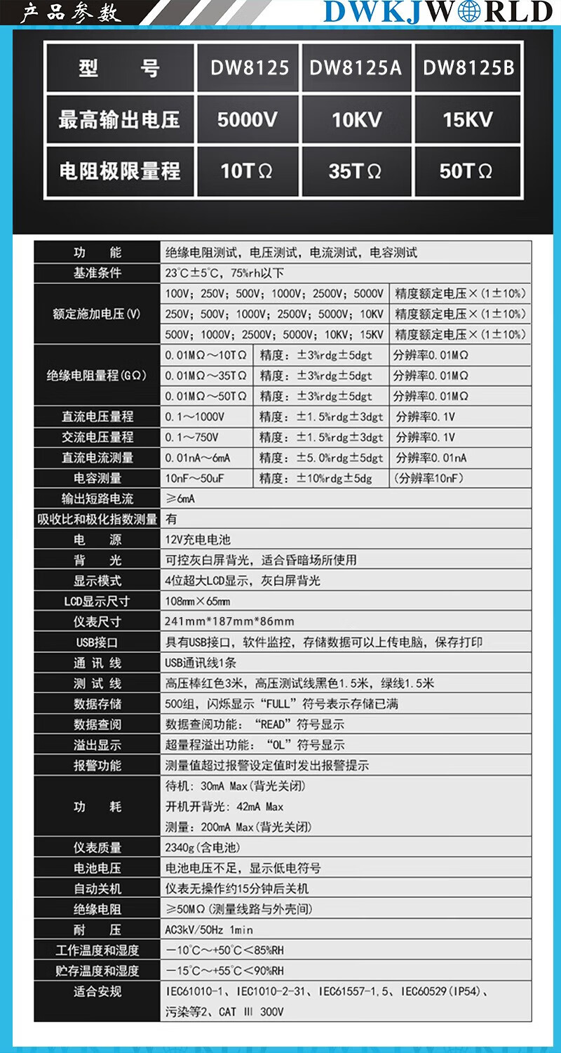 DWKJWORLDDW8125高压绝缘电阻测试仪(5KV,10TΩ)套